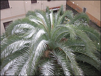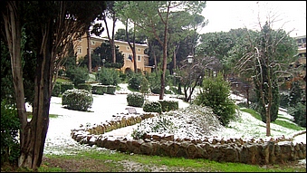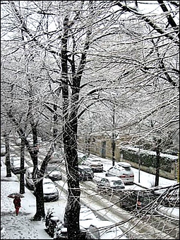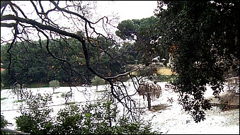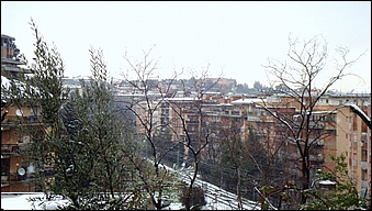 La nevicata su via del Trullo vista dall'interno di un negozio